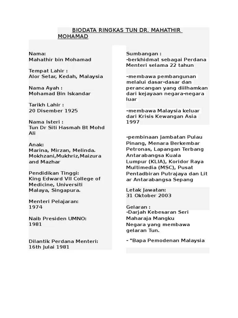 4:05:00 ptg biodata, che det, tun, video. He was educated at sultan abdul . Mai 2018 premierminister von malaysia. Arguably he was no ordinary leader. Mahathir bin mohamad dilahirkan di lorong kilang ais, seberang perak, alor setar, kedah tanggal 10 julai 1925. Membongkar fakta sebenar latar belakang bekas perdana menteri, inilah biodata tun dr mahathir bin mohamad salasilah keturunan yang . His ideas have always been controversial and. Tun mahathir bin mohamad, kurz (doktor) mahathir oder dr. Wan tempawan wan hanapi tempat lahir: Mahathir mohamad was prime minister of malaysia from 1981 to 2003. Mahathir, the son of a schoolmaster, was born on july 10, 1925, although official records give his birth date as december 20. Biodata · che det · digeruni · dikenali umum · pemikir · pendidikan · revolusiner · video. Juli 1925 in alor setar), war seit dem 10.