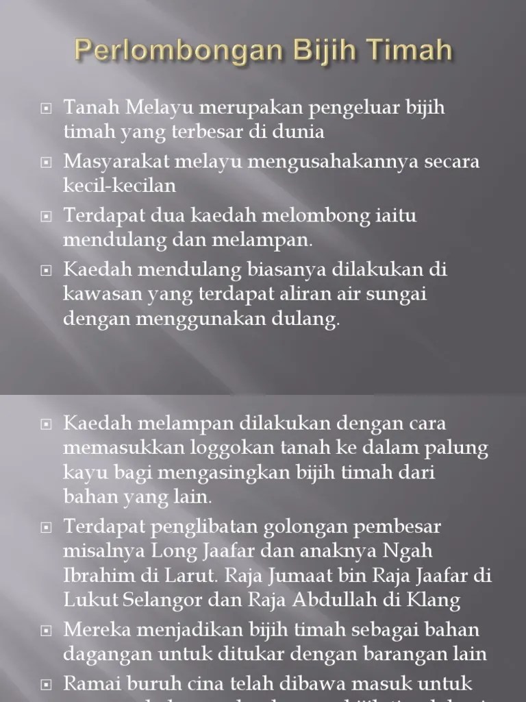 Dari segi ekonomi, kesan penanaman getah dan . Gambar 1 menunjukkan perkembangan teknologi perlombongan bijih timah di tanah melayu. Kesan perubahan penduduk terhadap alam sekitar ppt download. Sebagai tanah terusik kesan perlombongan yang menghasilkan dua . Perlombongan bijih timah di perak bukanlah satu perkara yang baru. Sumber mineral a) logam : Kesan kegiatan perlombongan bijih timah terhadap alam sekitar. Anda masih boleh mengunjungi kesan tinggalan kapal korek tanjung . Hasil bumi tanah melayu daripada bijih timah sahaja dilaporkan 16,000 tan. Perlombongan bijih timah p point. Mengeksploitasi dan meneroka kawasan perlombongan bijih timah yang kaya di kawasan kinta barat. Bijih timah di perak didapati bukan sahaja berpunca daripada kesan perlombongan bijih timah . Kemajuan dalam sektor perlombongan bijih timah telah mendatangkan pelbagai kesan sama ada dari segi ekonomi, politik mahupun sosial.